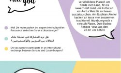 Mir treffen eis op verschiddene Platzen am Norde vum Land, fir eis iwwert eist Land, eis Kultur an eis Art a Weis fir ze liewen auszetauschen. Am läschten Atelier kachen an iessen mer zesummen traditionell lëtzebuergesch a syresch Platen.